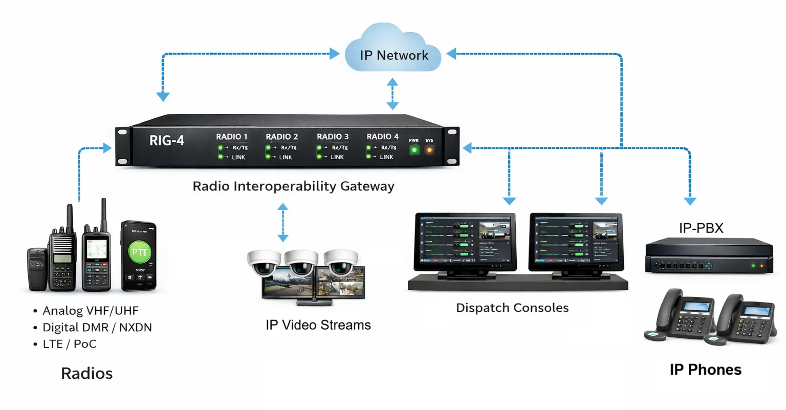 Radios ↔ IP Network ↔ Smartphones ↔ Dispatch Consoles ↔ Video Systems ↔ IP-PBX